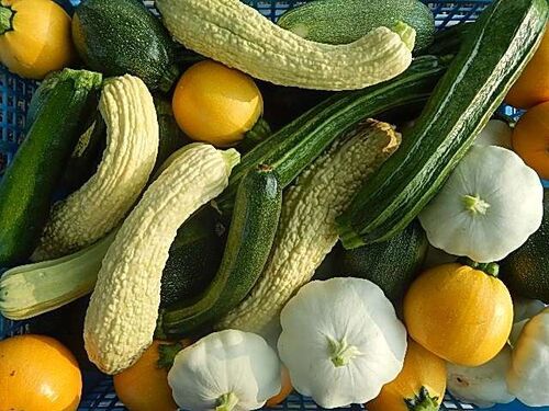 ズッキーニのチーズ焼き ズッキーニの季節がやって来ました。ホマレ姉さんの畑ではズッキーニも自家採種していますから8種類すべて違う畑に植えています。
