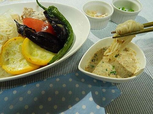 野菜たっぷりミルクそうめん 毎日暑いです、家にいると昼ご飯はそうめんばかりに、茹で時間2分が嬉しい…。でも、栄養は偏りそう…それにそろそろ飽きてきた…。