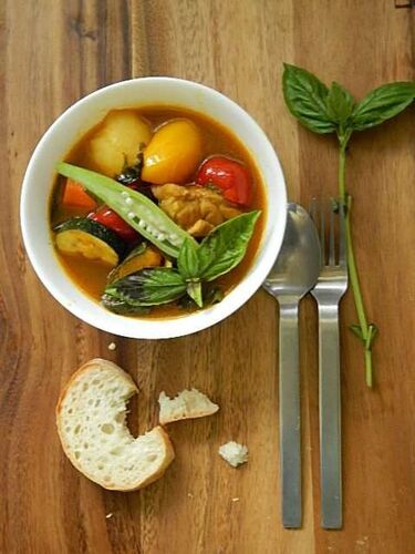 オクラ、ピーマン、ズッキーニ…いろいろ入ったスープカレー ホマレ姉さんの畑では夏野菜がそろそろ終わりに近づいてます。最後の収穫の前に夏野菜と生バジルがタップリ入ったスープカレーを作りました。
