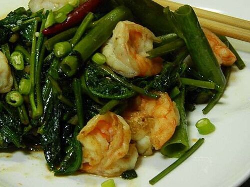 空心菜とエビのエスニック炒めとジャスミンゼリー 「今年は空心菜が美味しいね!」と娘。それは貴女の味覚が大人になったからよ。と思ったけれど、何も言わないでおいた。