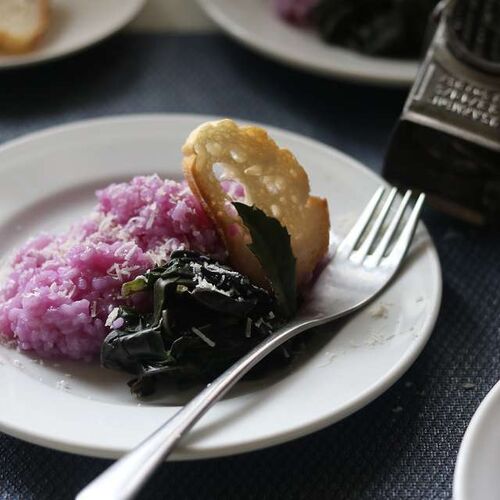 金時草のリゾット 独特の色と味、香りが特徴的な金時草は熱帯アジア原産のキク科の葉物ですが、日本に於いては食される地域がかなり偏在しているという、ちょっと面白い野菜です。