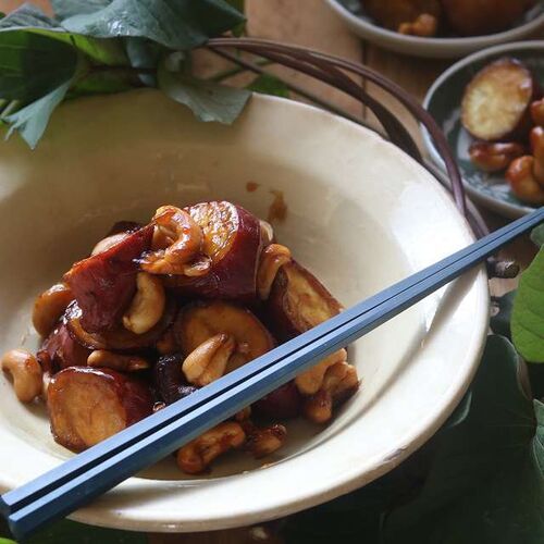 さつまいもとカシューナッツの甘酢炒め 秋も深まり、急に寒くなってきましたが、皆さんはいかがお過ごしですか? ホマレ姉さんは…と言えば、いよいよさつまいもの美味しい季節がやってきたぁ!…とワクワクして落ち着きません。