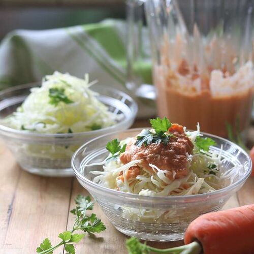 にんじんドレッシング 春キャベツが出回り始めましたね。冬キャベツは煮込料理に向きますが、葉の柔らかな春キャベツはやはり生で食べたいものです。