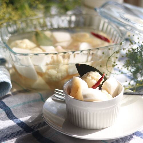 白のピクルス ホマレ姉さんの新しい畑で、カリフラワーが採れました。