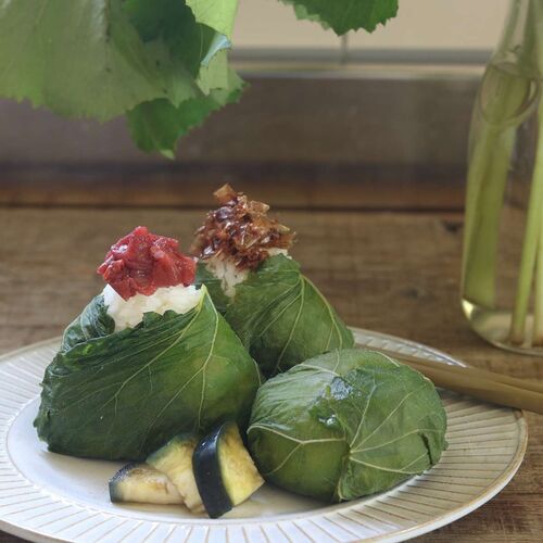 野蕗のおにぎり 春から初夏にかけて田舎でよく見かける野蕗(山蕗)は姉さんの大好物。葉っぱが人の手くらいの大きさになると、いつ採ろうかと気になって仕方ありません。 野蕗の代表料理と言えば茎を伽羅色に煮込んだ伽羅蕗が有名ですね。茎の皮を剥く手間…
