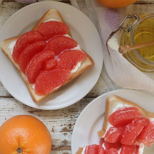 ピンク・グレープフルーツのオープン・サンド 本日は最近姉さんがハマっている、ピンク・グレープフルーツのオープン・サンドをご紹介します。